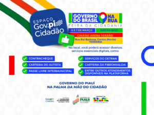 Durante o evento, os moradores poderão acessar a plataforma de governo digital do Piauí, o Gov.pi Cidadão, e conhecer os serviços digitais disponíveis ao público. No local, haverá suporte para baixar o aplicativo, realizar cadastro e aprender a utilizar as funcionalidades de forma rápida, simples e diretamente pelo celular.