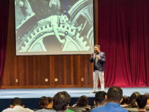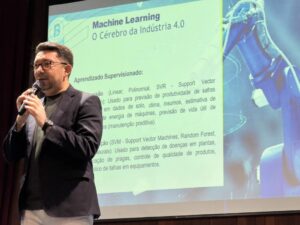 Durante sua apresentação, Ellen Gera abordou temas como Machine Learning (Aprendizado de Máquina) e Internet das Coisas (IoT), destacando como essas tecnologias estão transformando a Indústria 4.0. Ele enfatizou a importância da integração entre dispositivos inteligentes e sistemas automatizados para otimizar processos produtivos, reduzir custos e aumentar a eficiência operacional.